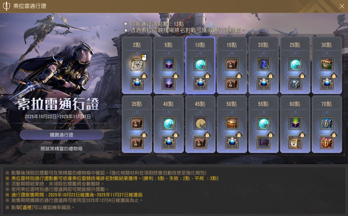每當達成累積點數區間,即可獲得索拉雷通行證獎勵!