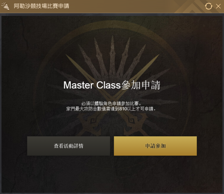 比賽形式 | 阿勒沙競技場 / 相同裝備、相同職業1:1淘汰賽 |