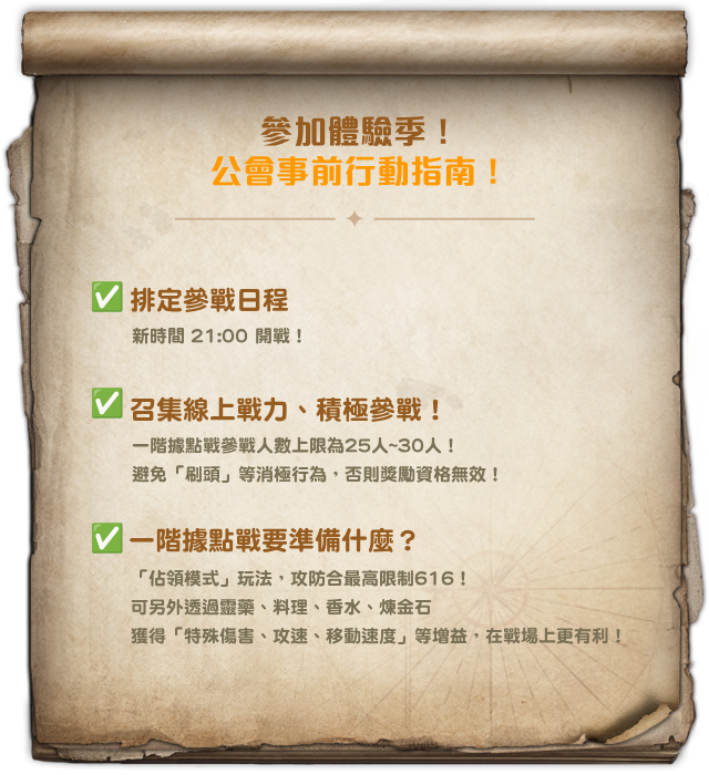 參加一階據點戰,無論勝敗,活動結束後返還所有消耗的PvP靈藥、香水!