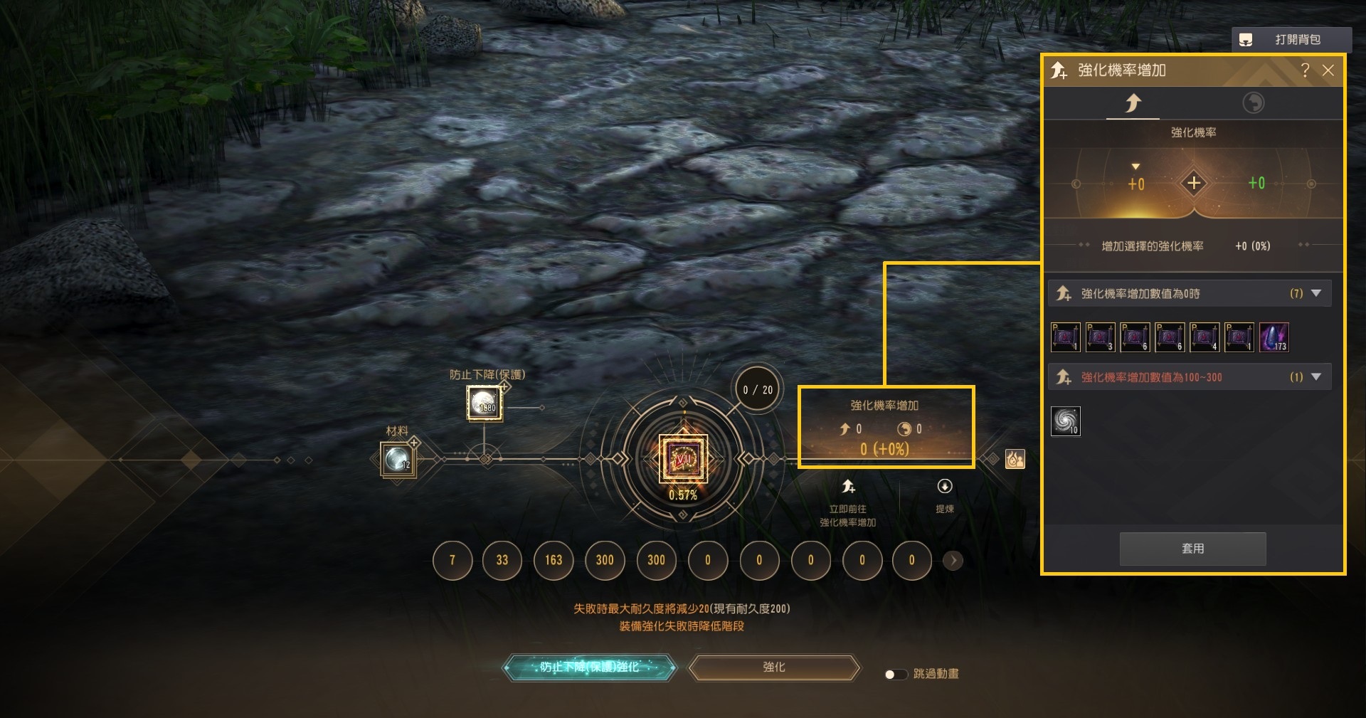 - 點擊「強化機率增加」區塊,可選擇並套用增加強化機率的道具