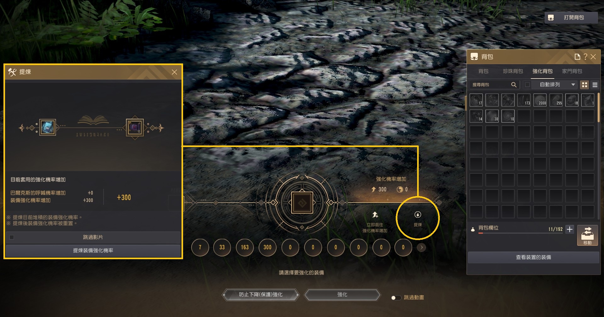 - 點擊「提煉」區塊,可以將目前套用中的強化機率增加數值重新轉換為道具型態