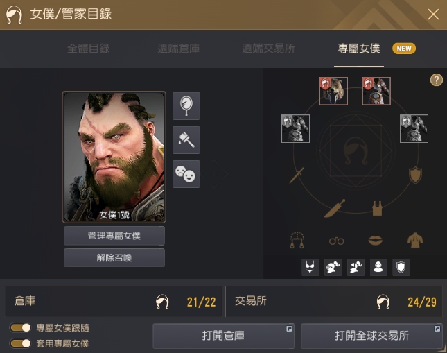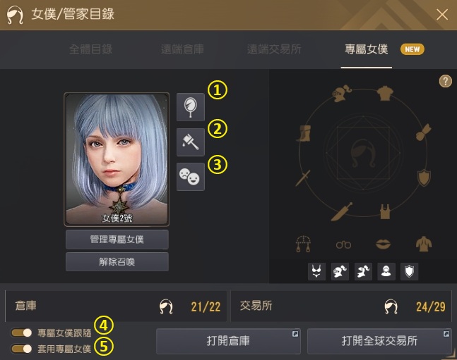 - 在女僕/管家目錄 → 專屬女僕分頁中,可以使用各種與專屬女僕相關的功能
