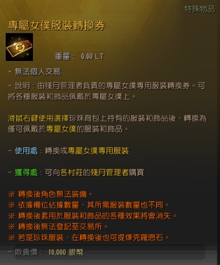 - 專屬女僕服裝轉換券可於各村莊及大城市的殘月管理者處購買(1,000,000銀幣)