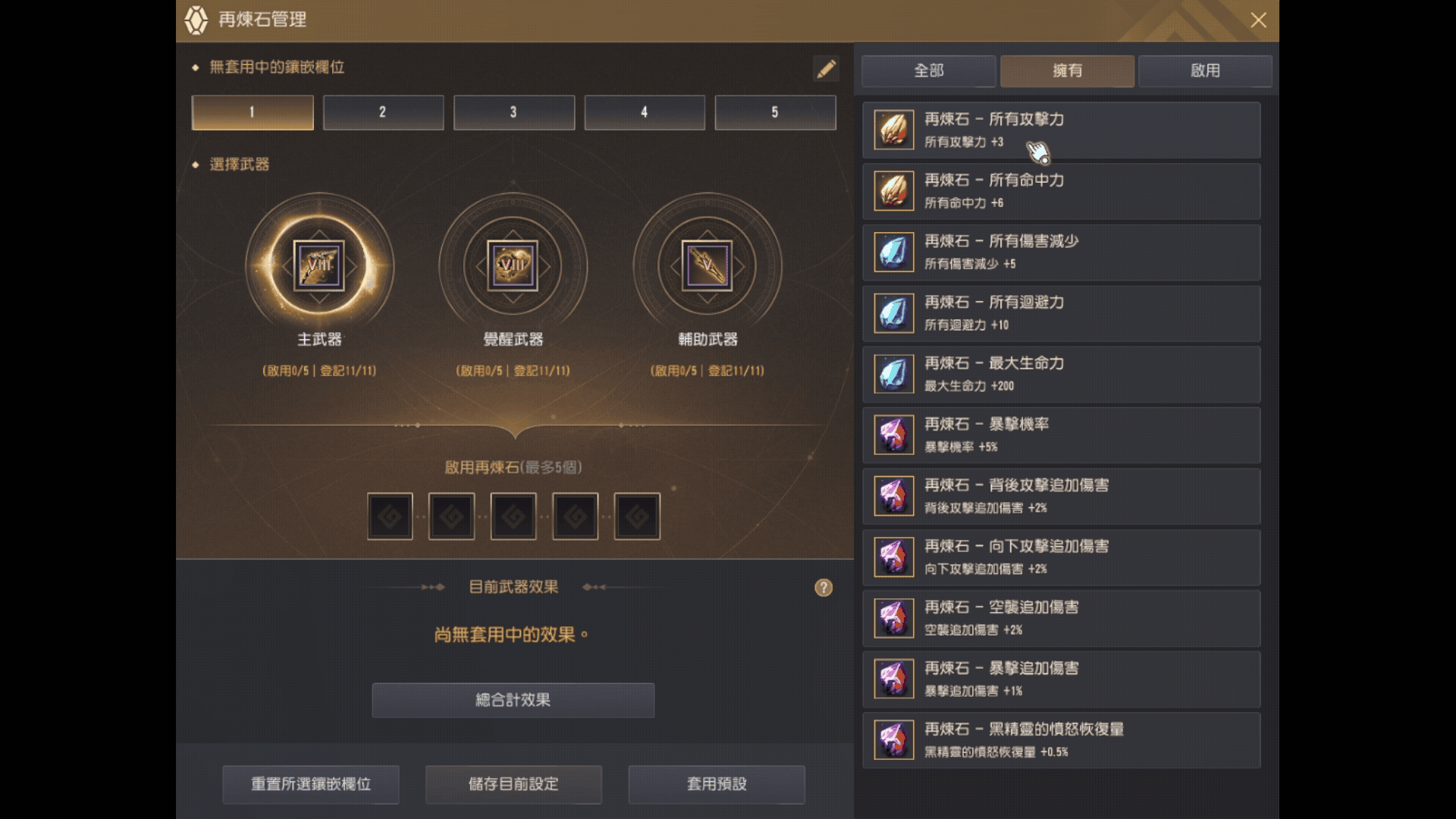 - 再煉石需分別登錄於主武器、覺醒武器、輔助武器,且每個欄位都必須啟用再煉石