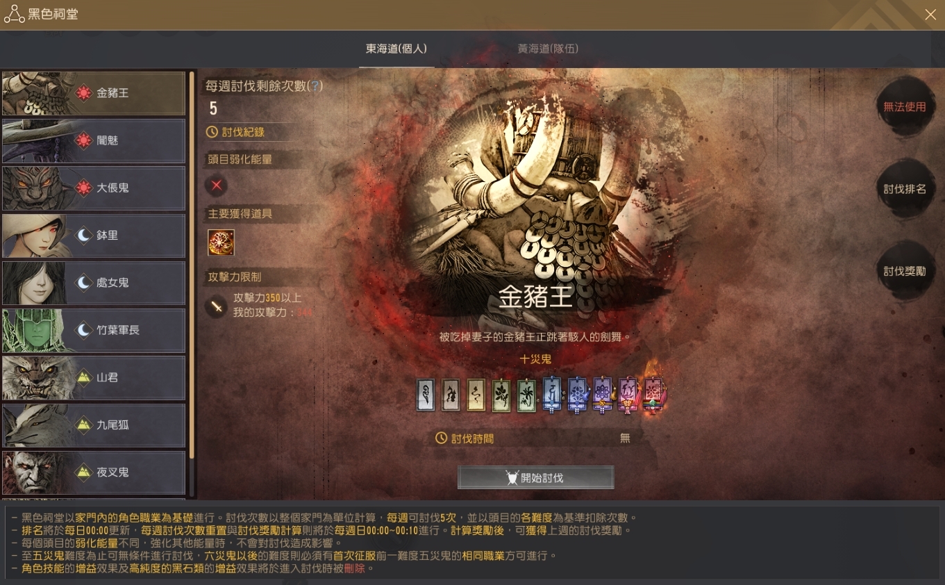 ※ 本獎勵依照各頭目類別,每家門只能各獲得1次「十災討伐戰利品 : (正一品)」,