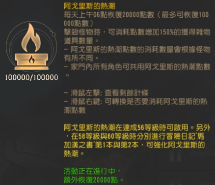 ※ 阿戈里斯的熱潮每日恢復量的最大數值為20,000點,