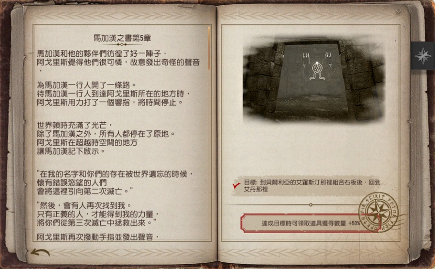 完成至「馬加漢之書」第1本第5章時,雜物道具獲得數量增加至150%!