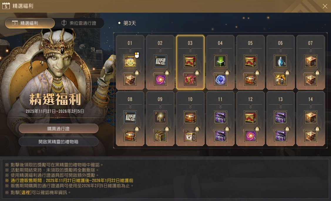 ※ 領取的精選福利獎勵可在黑精靈的禮物箱(B)中確認。