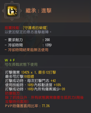 - 獲得繼承 : 守護者的榮耀技能後,使用進擊技能時將自動發動