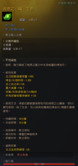 - 肯恩之心臟:生命的使用效果中,新增「生活經驗值獲得量+30%」效果
