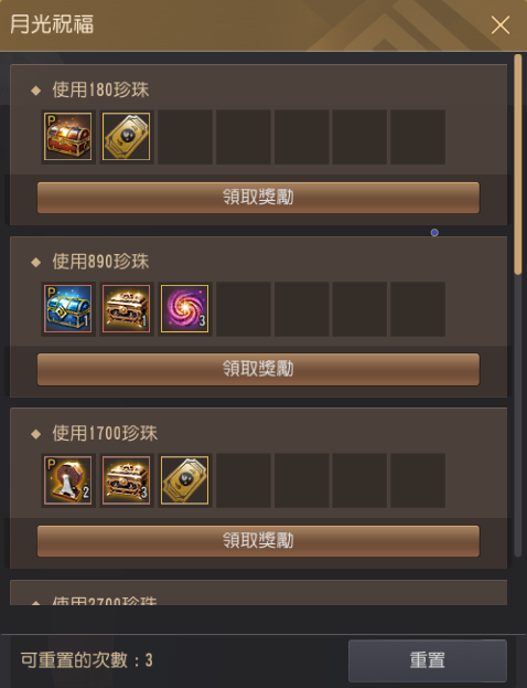※ 若完成月光祝福進度獲得所有獎勵,在活動期間可進行重置3次 。 (所有獎勵共可領取4次)