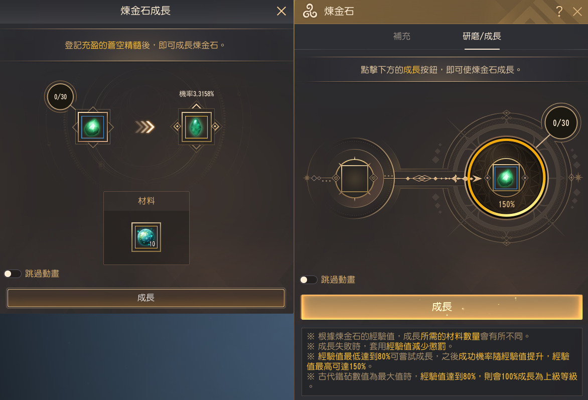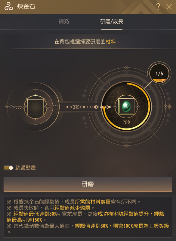 - 將不完整的煉金石進行成長時,可獲得「堅固的」煉金石