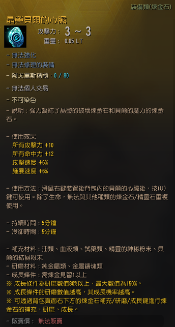 - 與「晶瑩的/華麗的/閃亮的」煉金石結合的貝爾的心臟,無法透過「深紅的貝黑萊特型煉金石外型」將外型改良為貝黑萊特型心臟