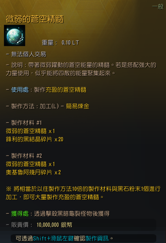 - 充盈的蒼空精髓可透過簡易煉金以下製作材料來獲得