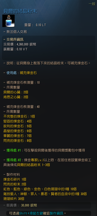 ※各製作方法可透過10倍材料與黑石粉末1個進行簡易煉金來大量製作 |