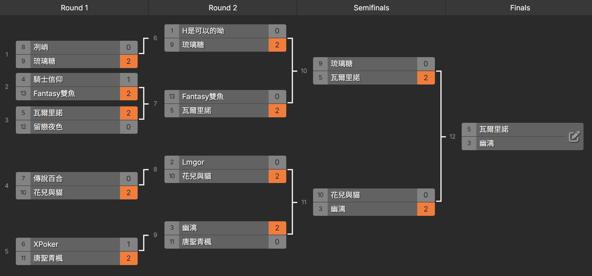 | 魔女、女武神、黑暗騎士 | 14:30 (璐璐飛-1、梅迪亞-3、瓦倫西亞-3) |