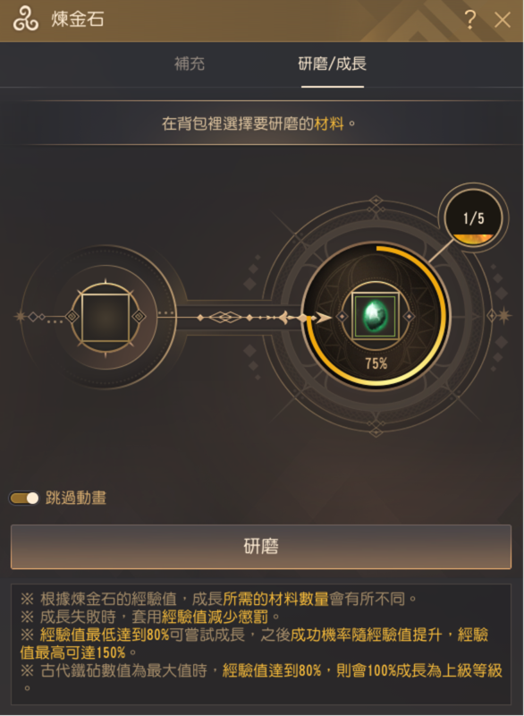 須先透過研磨將煉金石的經驗值提升到一定水準(80%~150%)才能夠嘗試進行成長。