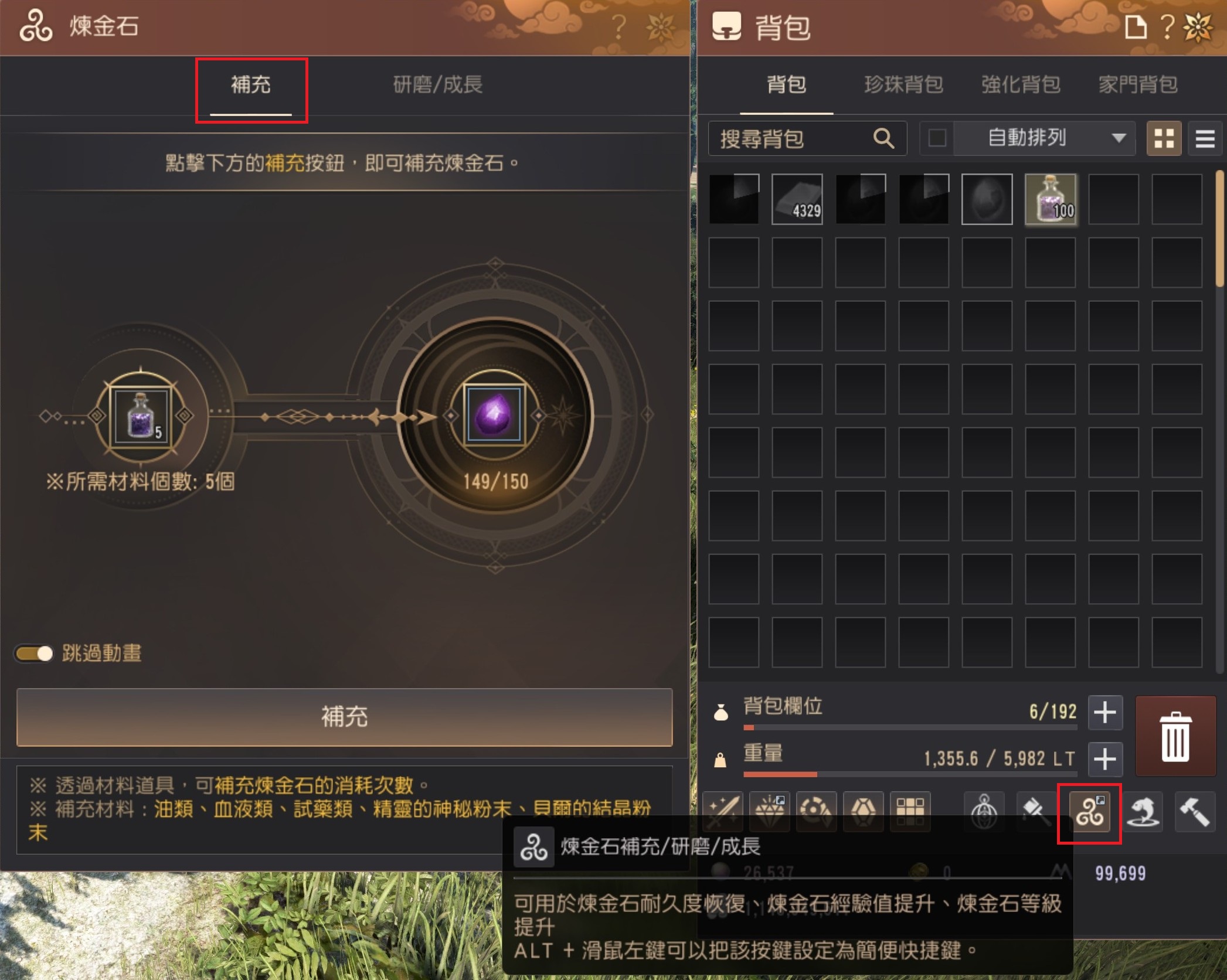 ▲ 在背包中按下煉金石按鈕的話,就會顯示可以補充煉金石的視窗。