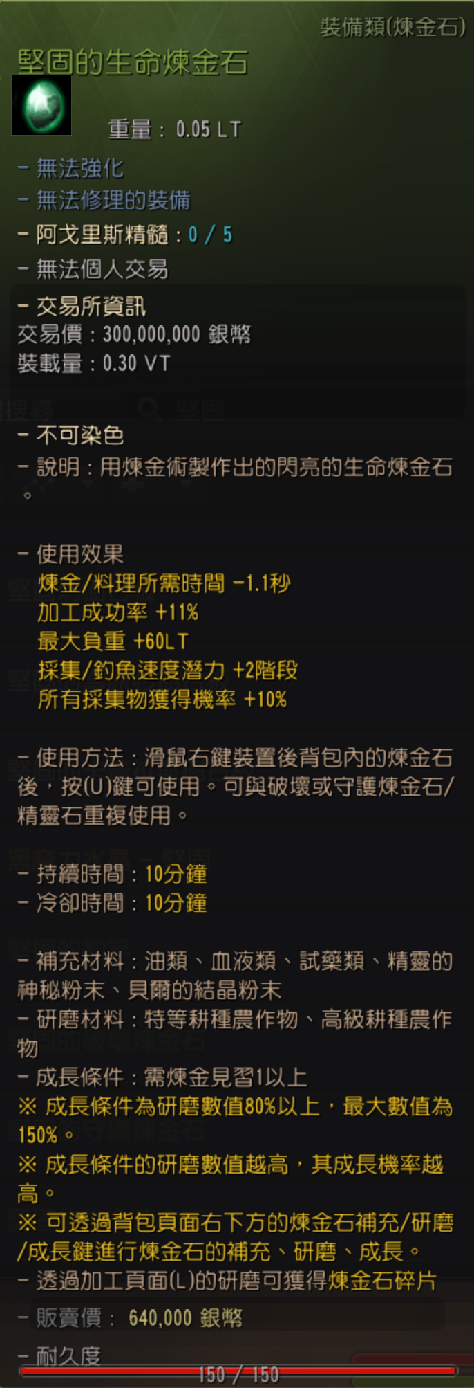 生命的煉金石其效果會持續10分鐘,冷卻時間同樣也需要10分鐘。