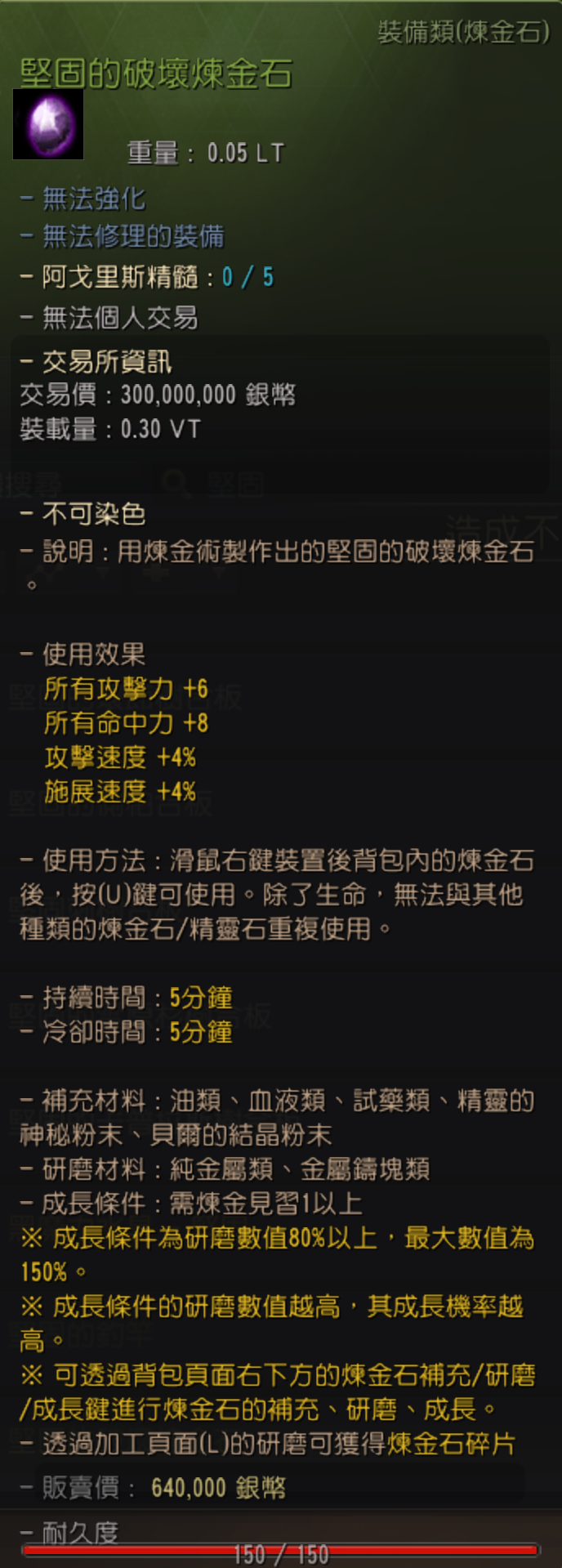 使用時消耗煉金石耐久度1,角色於一定時間內可獲得增益效果。