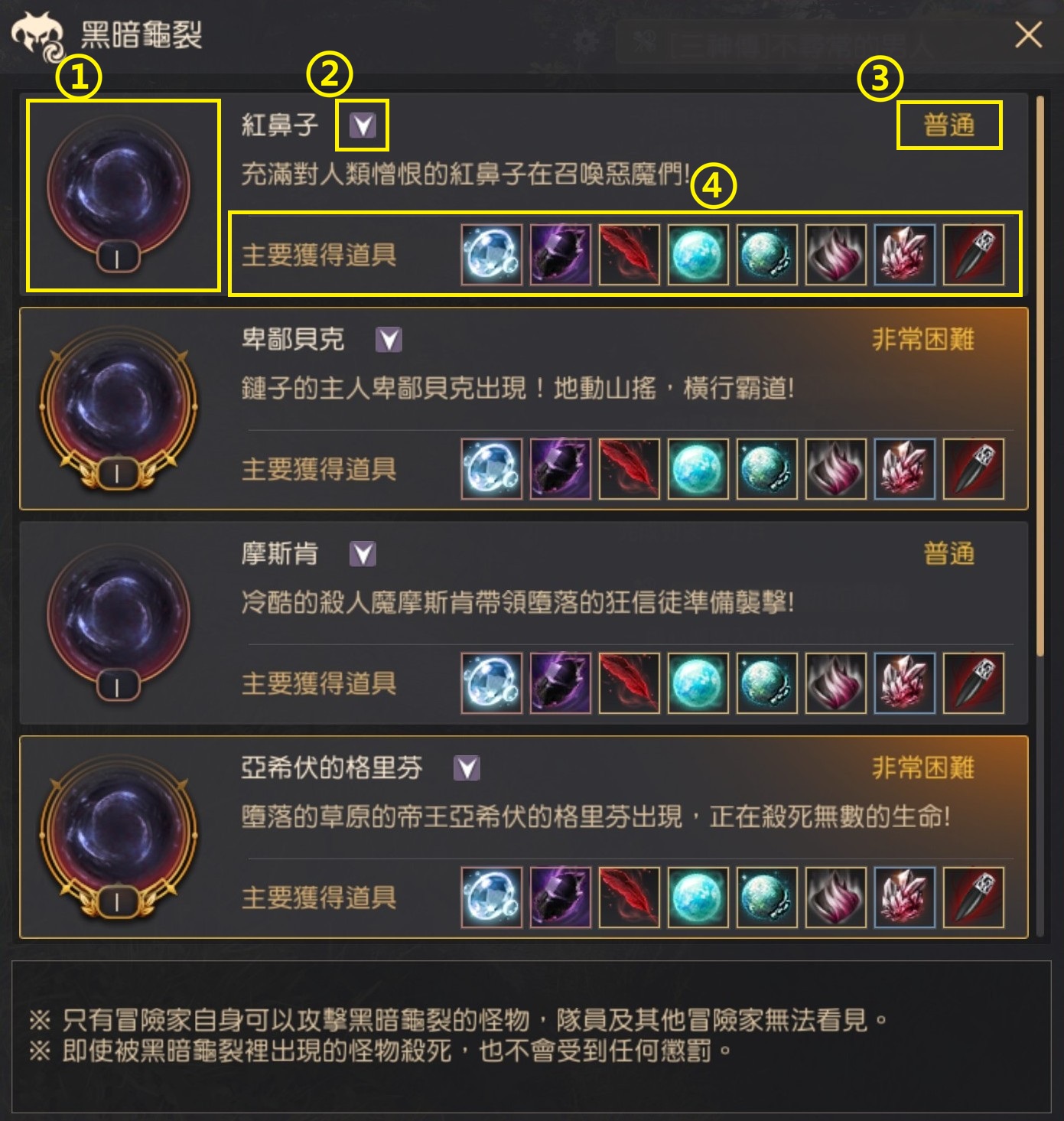 ※ 黑暗龜裂頭目只會出現在自己面前,只能單人討伐。