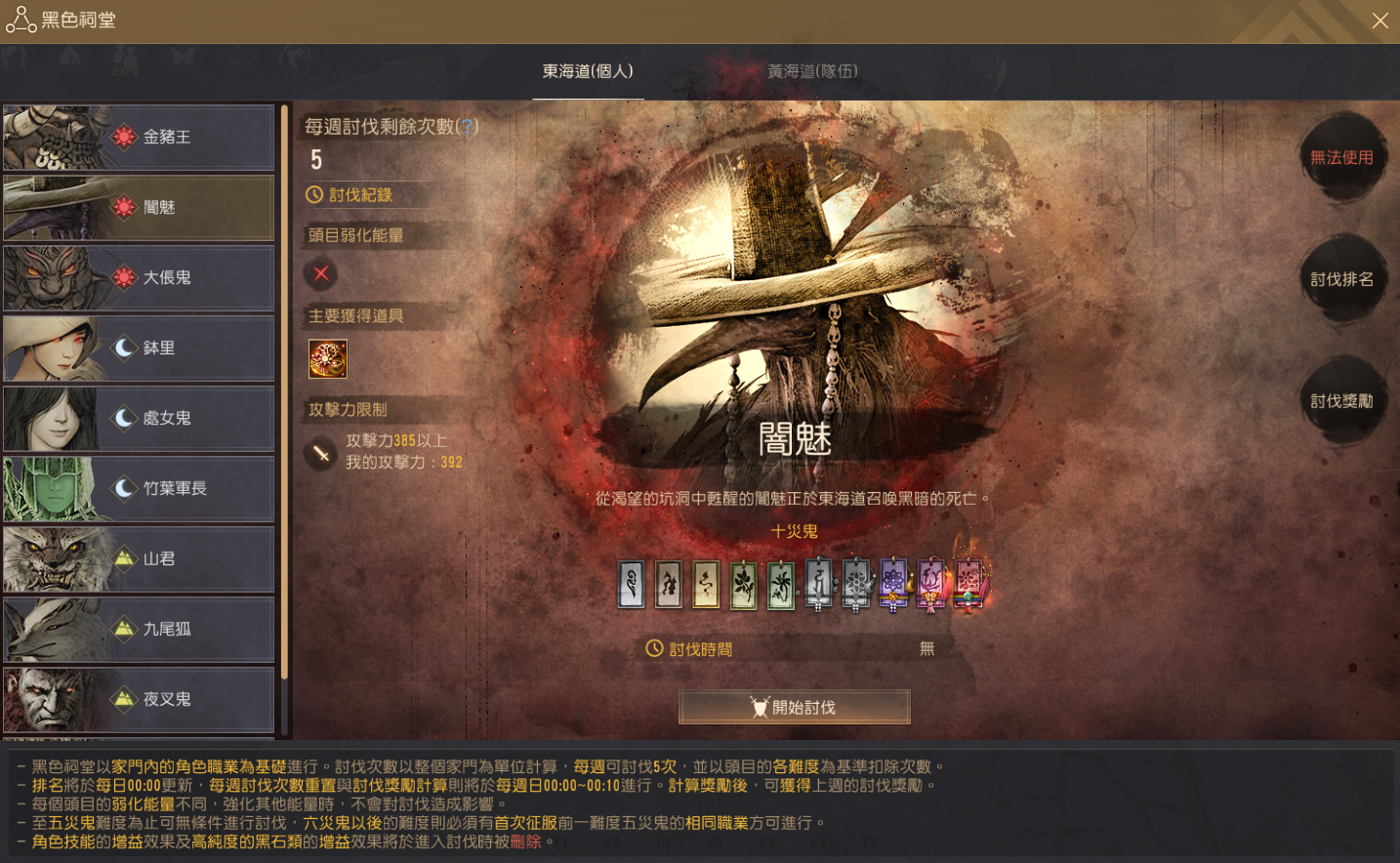 由於闇魅是東海道的最終首領,其最低攻擊力門檻設定得比大倀鬼更高;相對地,成功討伐後可獲得的部分戰利品也已上調。