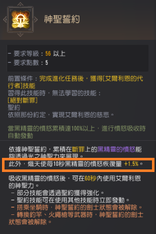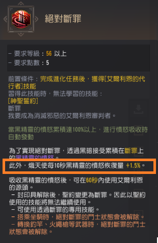 - 被動效果 : 每10秒黑精靈的憤怒恢復量+1.5%