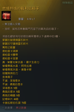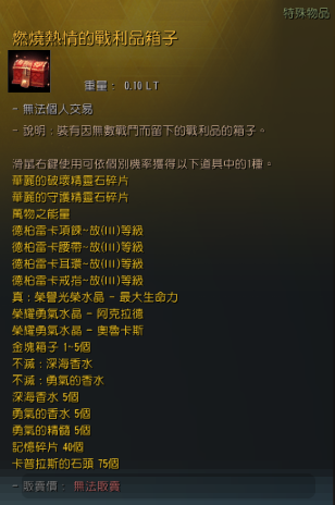 光榮的戰場金塊10kG 1個 → 2個 光榮的戰場金塊1kG 5個 燃燒熱情的戰利品箱子 3個 → 5個 (內容物變更) 陰涼碎片 10個 → 20個 電光之痕 15個 → 20個 獲得道具增加咒文書 3個 燦爛榮耀勳章 100個 卡普拉斯的石頭 150個 |