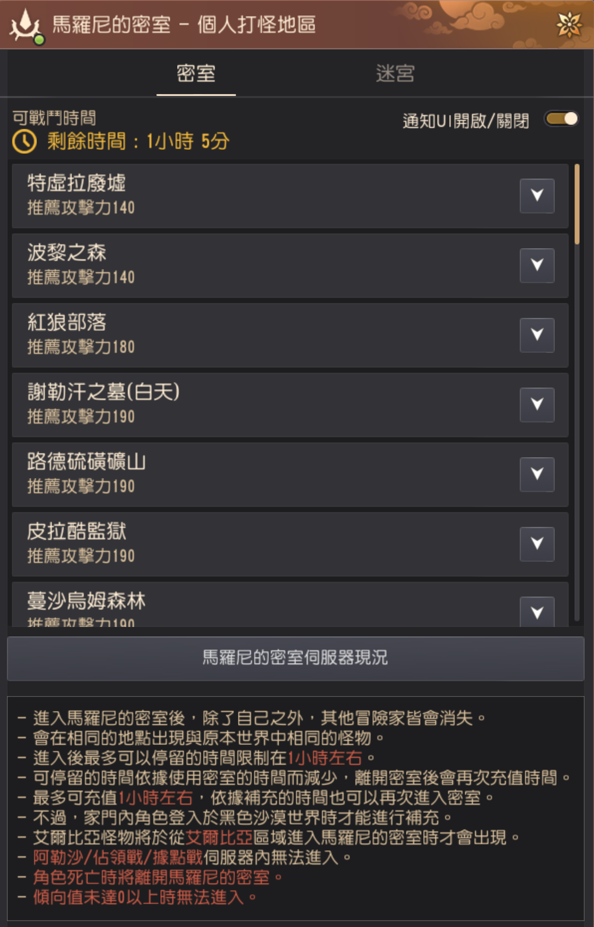 ※ 現在伺服器的馬羅尼的密室現況可以在左側UI上確認。