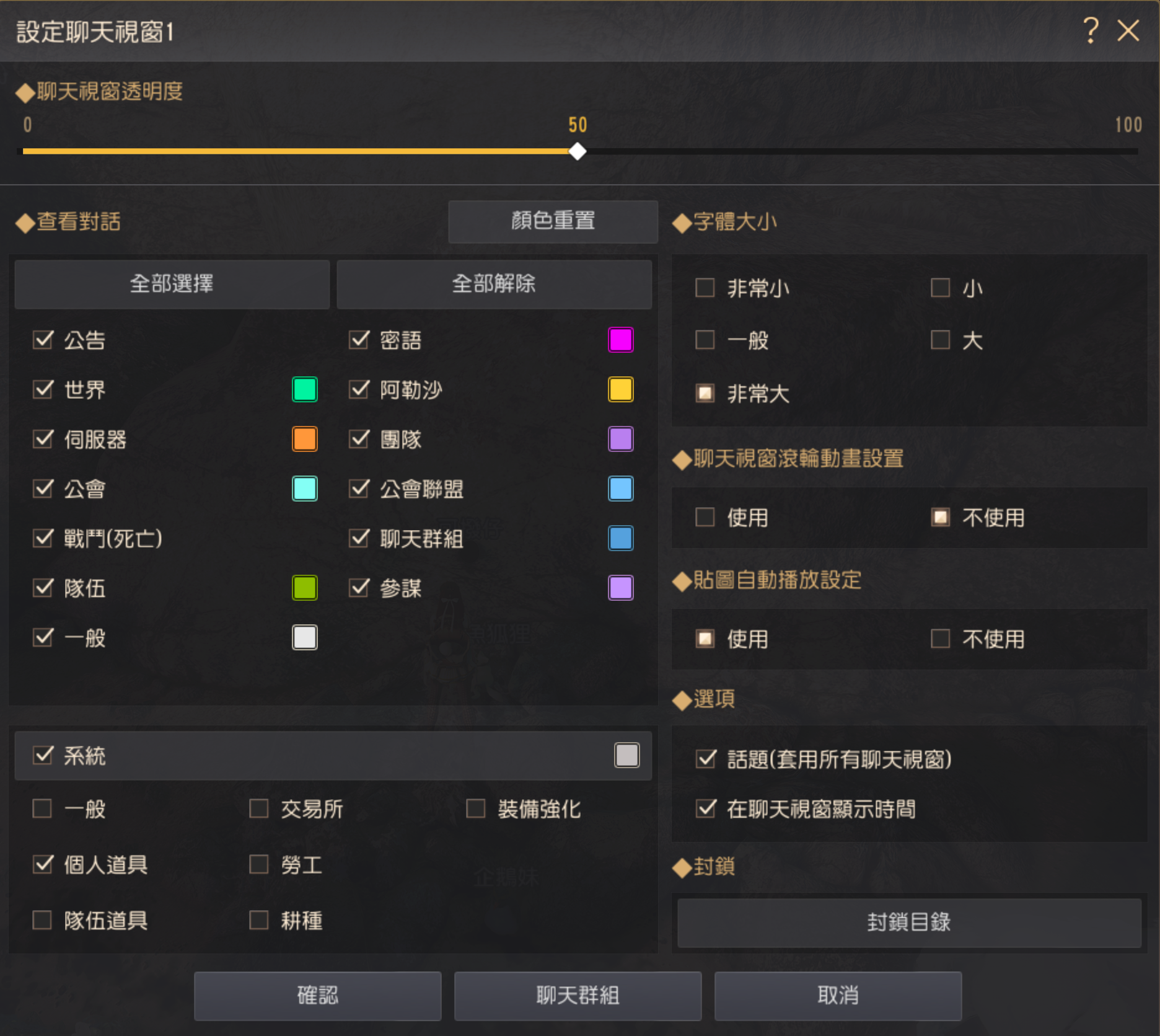 - 查看對話 : 可在該對話視窗鐘選擇想看的訊息種類,於查看對話選擇各項目別的顏色,可以將文字變更為想要的顏色