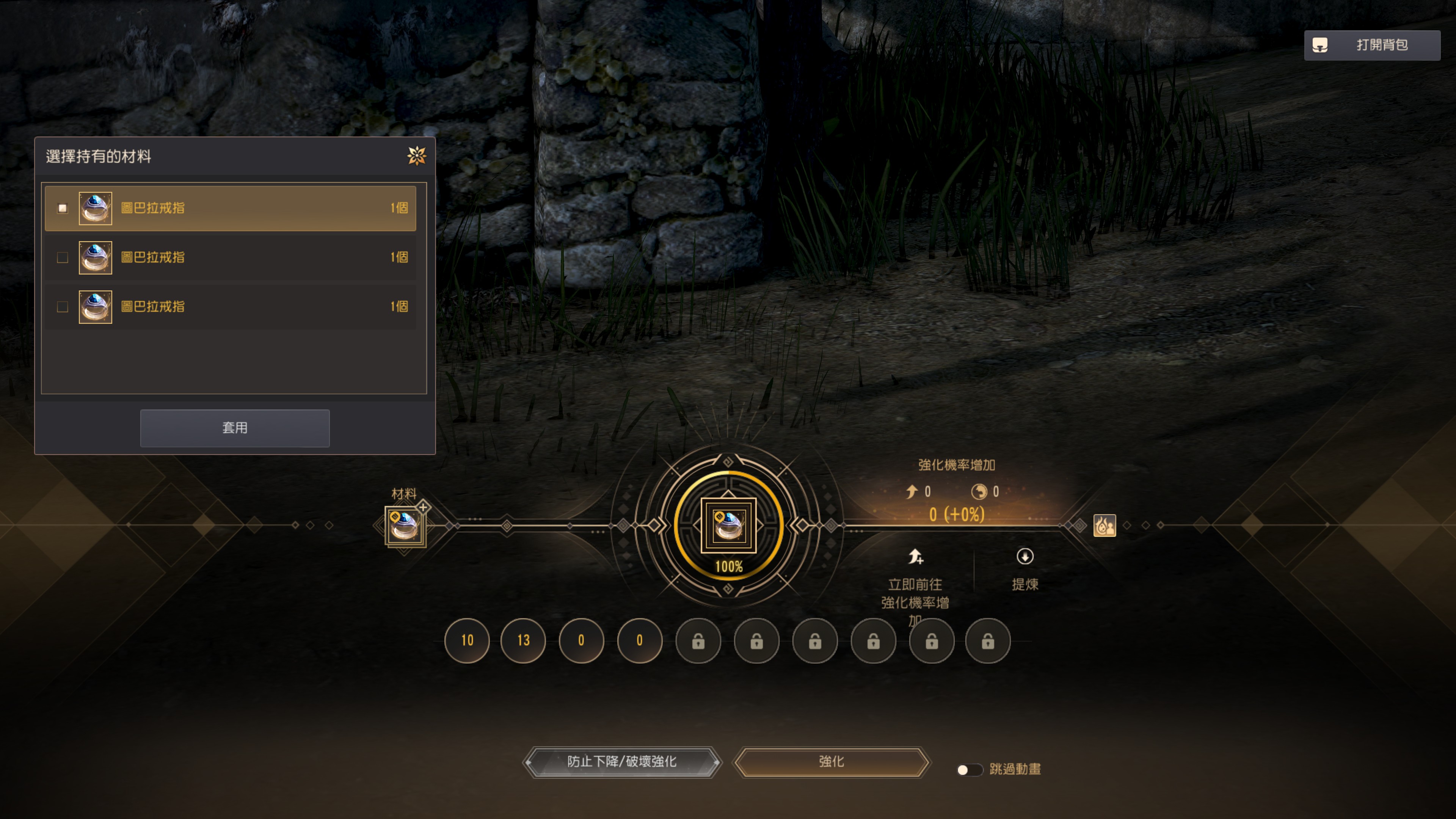 因為失敗時裝備會被破壞所以建議增加「強化成功機率」之後嘗試強化。