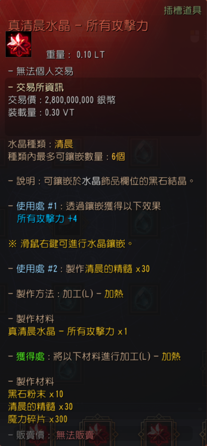 | 真清晨水晶 - 所有攻擊力 | 清晨的精髓 30個 | 黑石粉末 10個 | 魔力碎片 300個 |