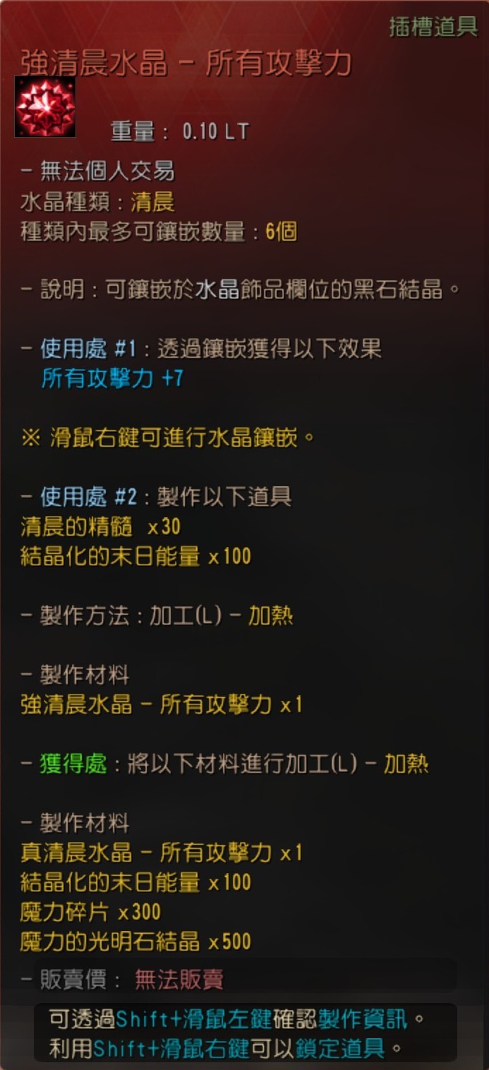 ![]() ![]() ![]() ![]() ![]() 真清晨水晶 - 所有攻擊力/黑精靈的憤怒/命中力/傷害減少/迴避力