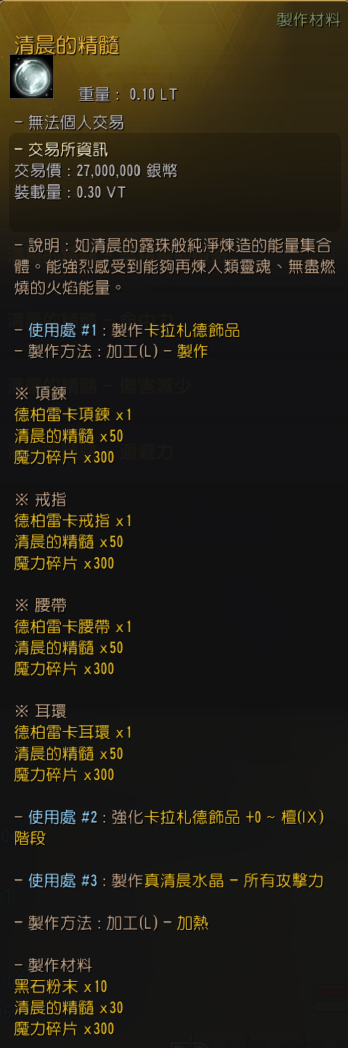一般「清晨的精髓」可用於卡拉札德飾品的製作或強化等,