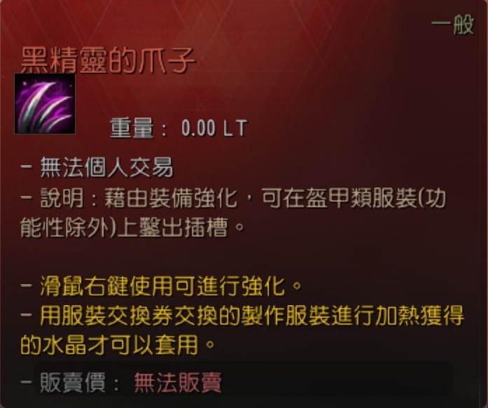 ▲ 藉由組合獲得的黑精靈的爪子無法在NPC商店或交易所中販售。