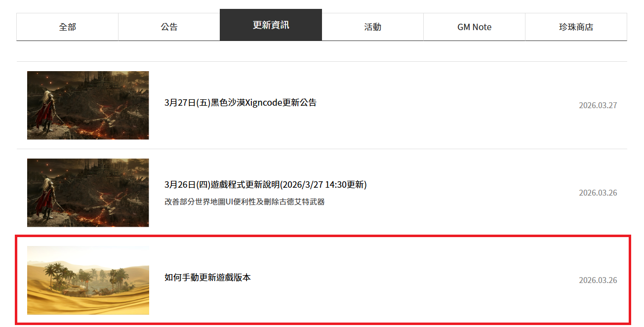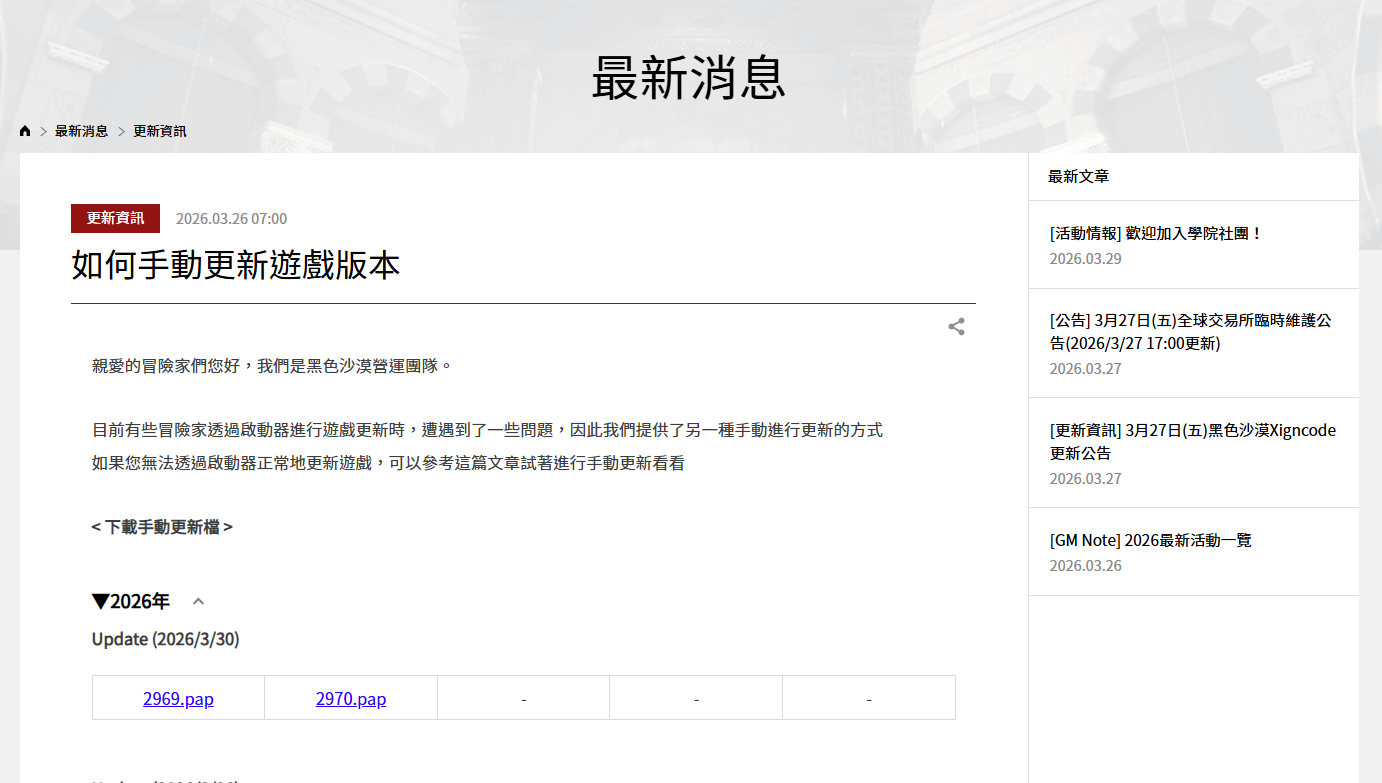 前往《黑色沙漠》官方網站,下載所有數字大於目前安裝的遊戲版本的更新檔